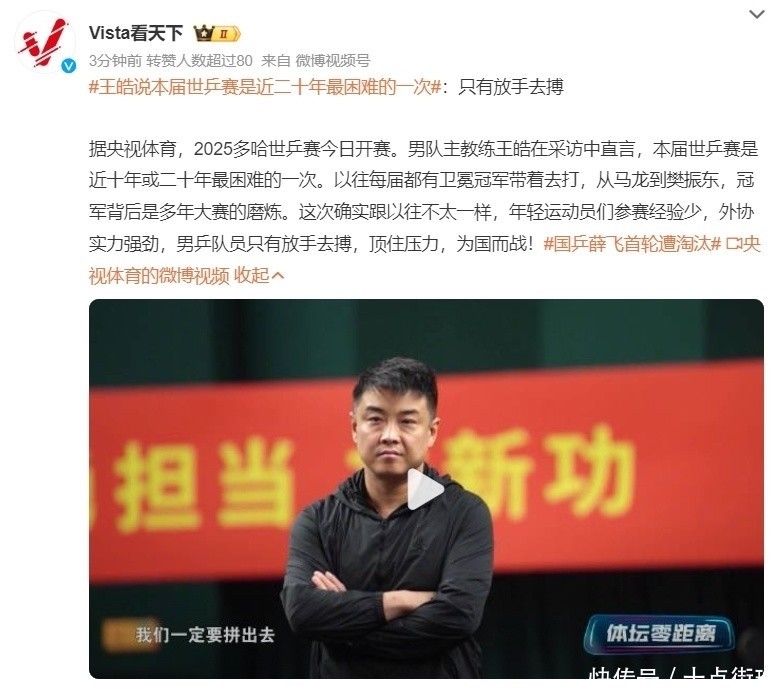北京时刻5月17日,2025年多哈世乒赛在卡塔尔拉开战幕,中国乒乓球队首日便遭逢“开门黑”,男单选手薛飞在首轮比赛中不测出局,成为本届赛事国乒首位“一轮游”选手,这一后果与赛前男队主培植王皓在央视《体坛零距离》节目中的发言酿成微妙呼应,王皓直言,本届世乒赛是“近20年最艰苦的一次”,敕令球迷对年青选手保抓感性期待,尤其是对第三次插足世乒赛的王楚钦,这番言论背后,既是对国乒新老瓜代阵痛期的澄莹默契,亦然对年青一代“破局”的深刻祈望